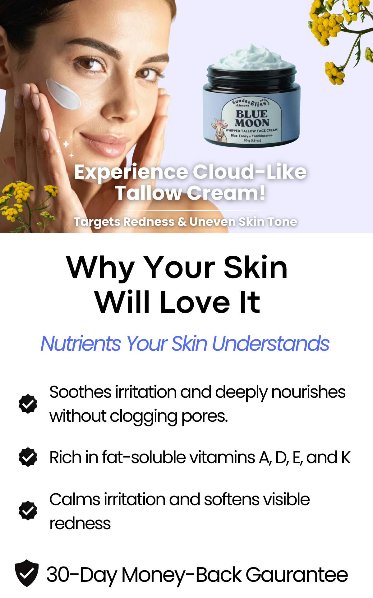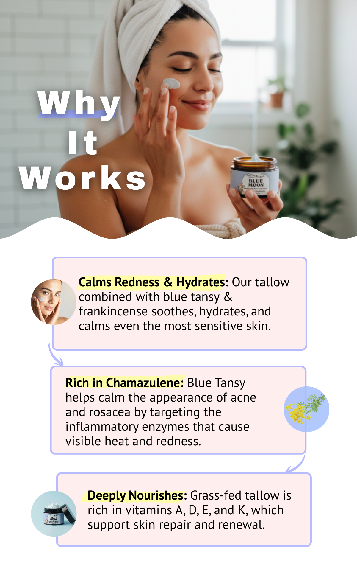 Blue Tansy tallow treats reactive skin by repairing the natural barrier and calming inflammation. The grass-fed tallow mimics your skin’s own oils to seal leaky skin, which is essential for eczema and psoriasis. Simultaneously, the Chamazulene in Blue Tansy acts as a biological fire extinguisher. This duo effectively soothes intense itching, softens plaques, and clears acne by cooling heat and redness at a cellular level without stripping your skin.