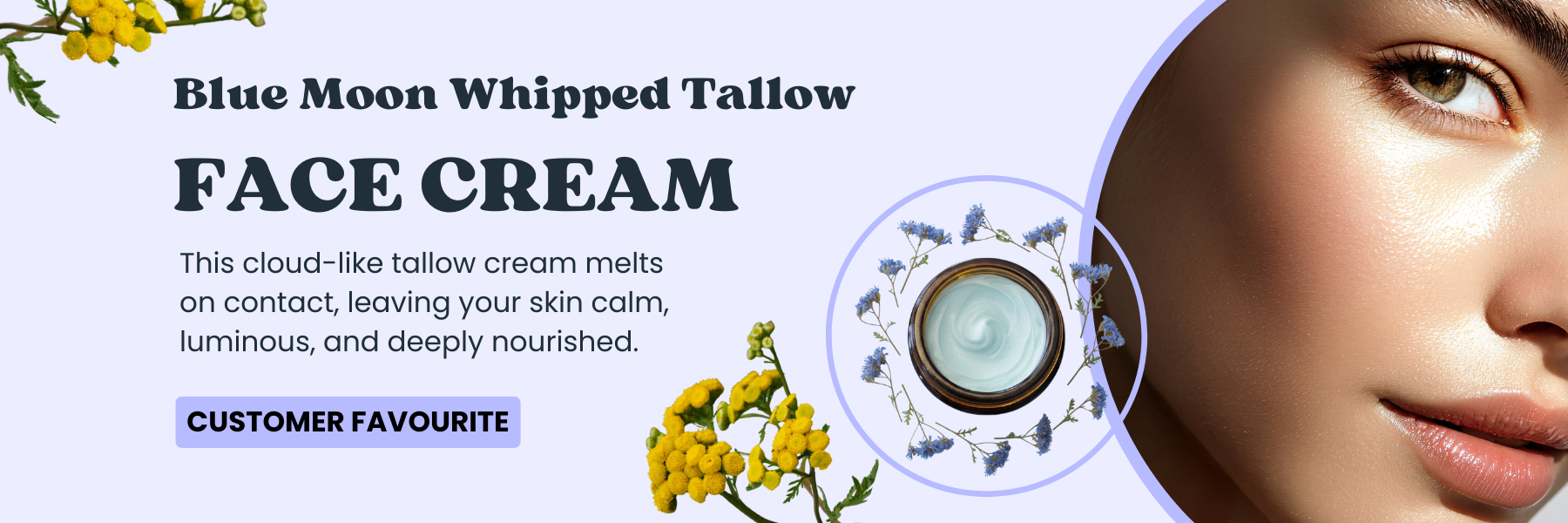Blue Moon is a dreamy, whipped tallow face cream that melts like butter and leaves your skin glowing, soft, and totally refreshed.